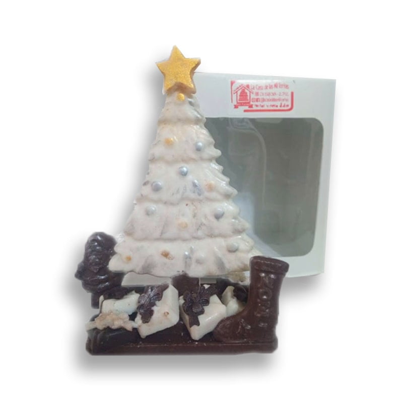 Figura de arbolito de navidad elaborado en chocolate blanco y con leche, perfecto para un detalle o para souvenir en las fiestas.