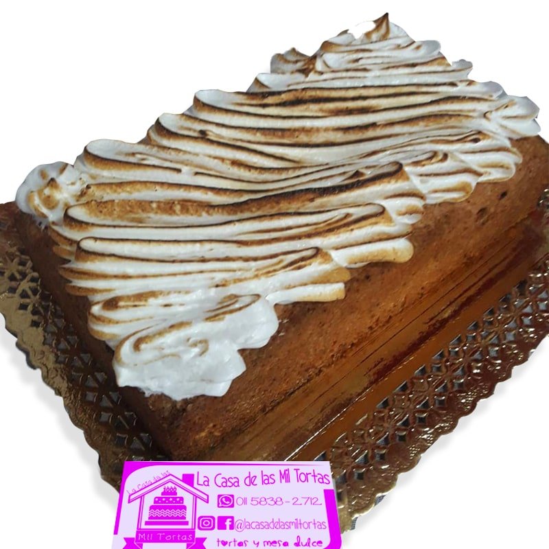 Budín de coco y dulce de leche decorado con merengue italiano.