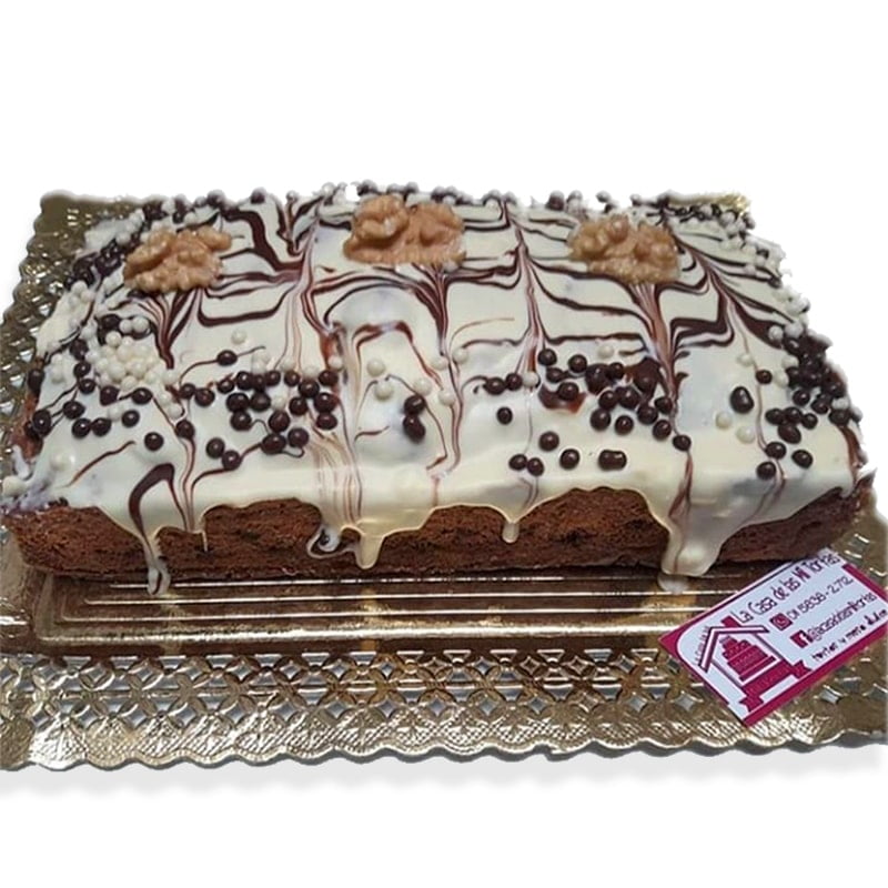 Budín húmedo relleno de nueces y chips de chocolate bañado en chocolate blanco y decorado con nueces.