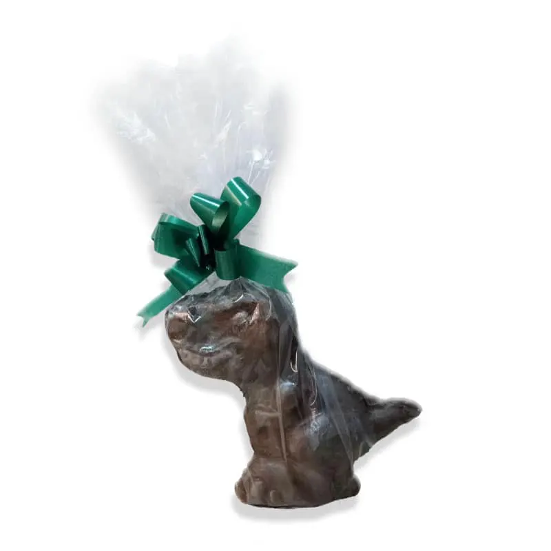 Dinosaurio de Pascua de 250g. elaborado de chocolate con leche, relleno de Rocklets de Arcor y huevitos de chocolate.