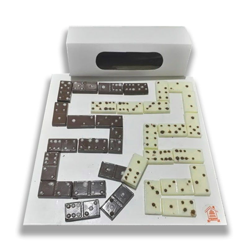 Dominó elaborado con chocolate blanco y con leche, presentado en caja visor para regalar.