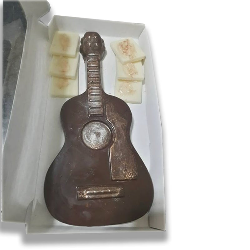 Figura de guitarra criolla de chocolate, presentada en caja regalo.