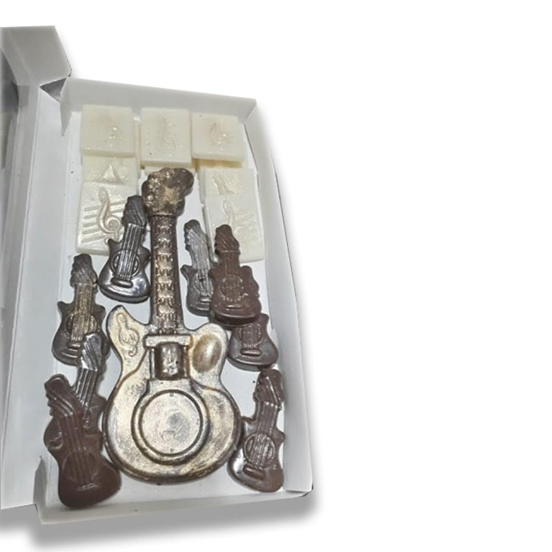 Figura de guitarra eléctrica de chocolate, presentada en caja para regalo.