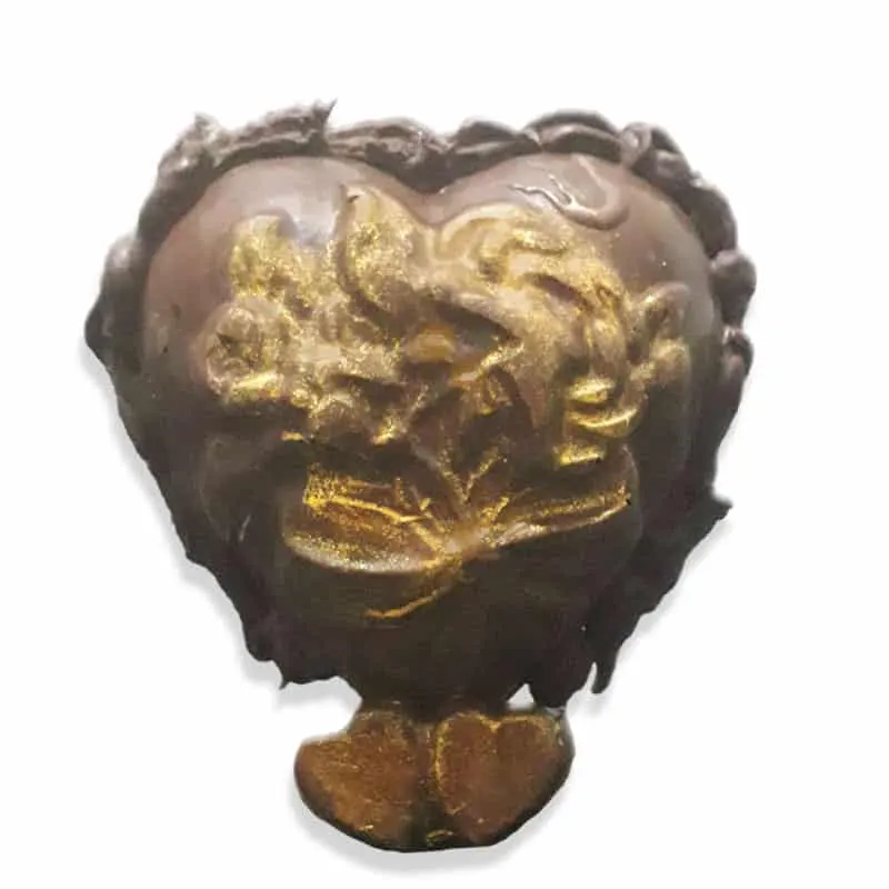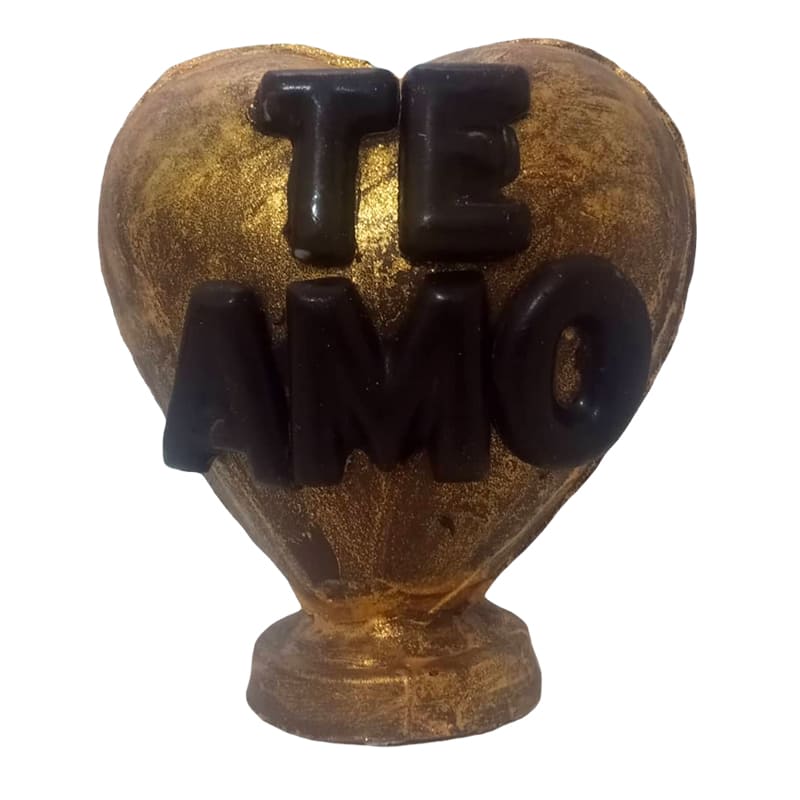 Huevo de chocolate con leche con forma de corazon de 150g.  Decorado con frase y pintado en tonos dorados.