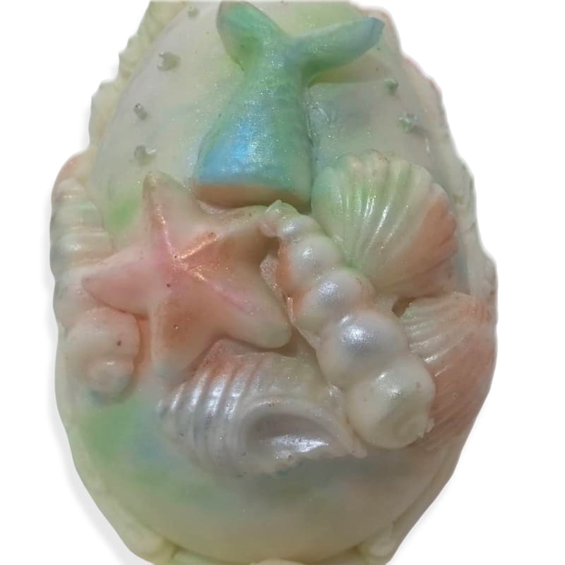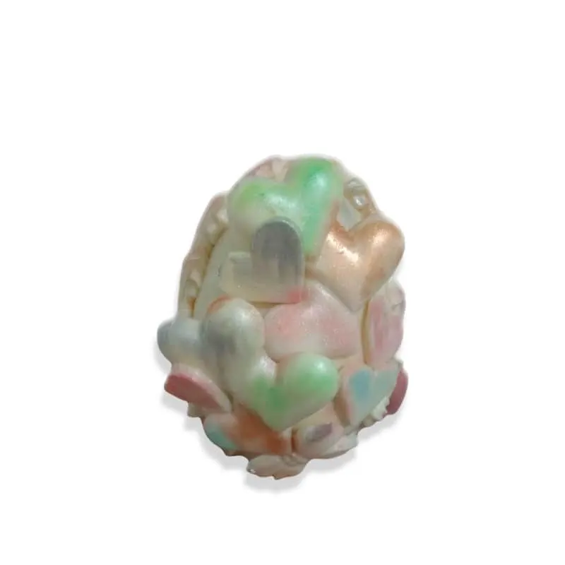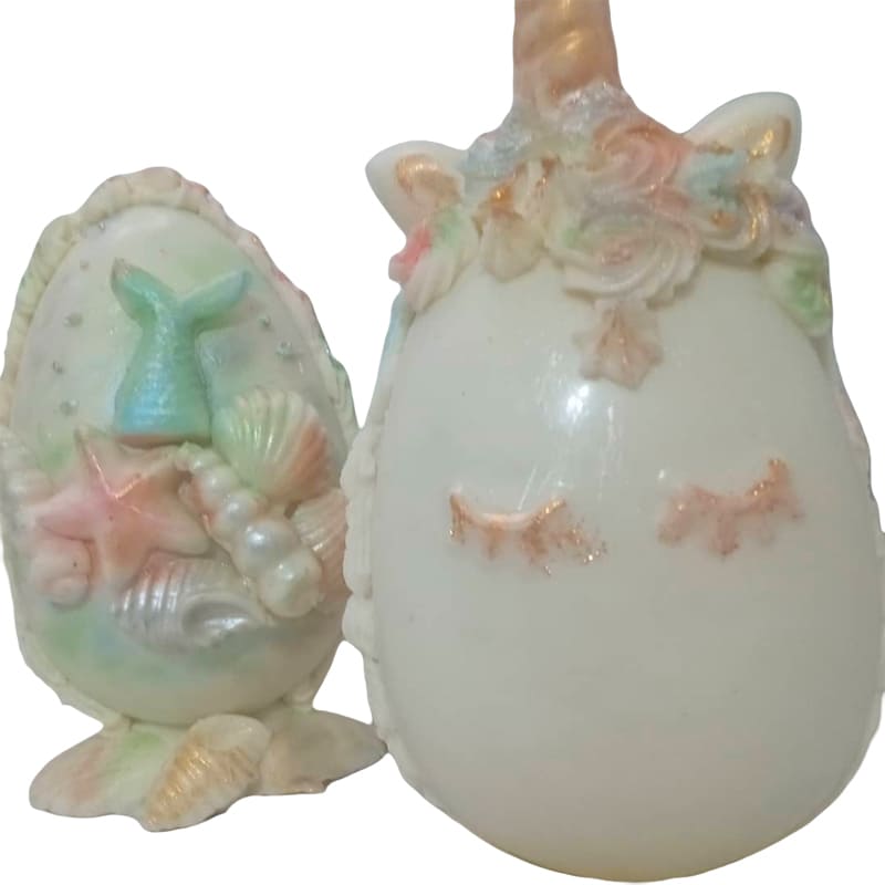 Huevos de Pascua elaborados de chocolate blanco, pintados a mano. Decorados con temática de corazones, unicornio o bajo el mar.