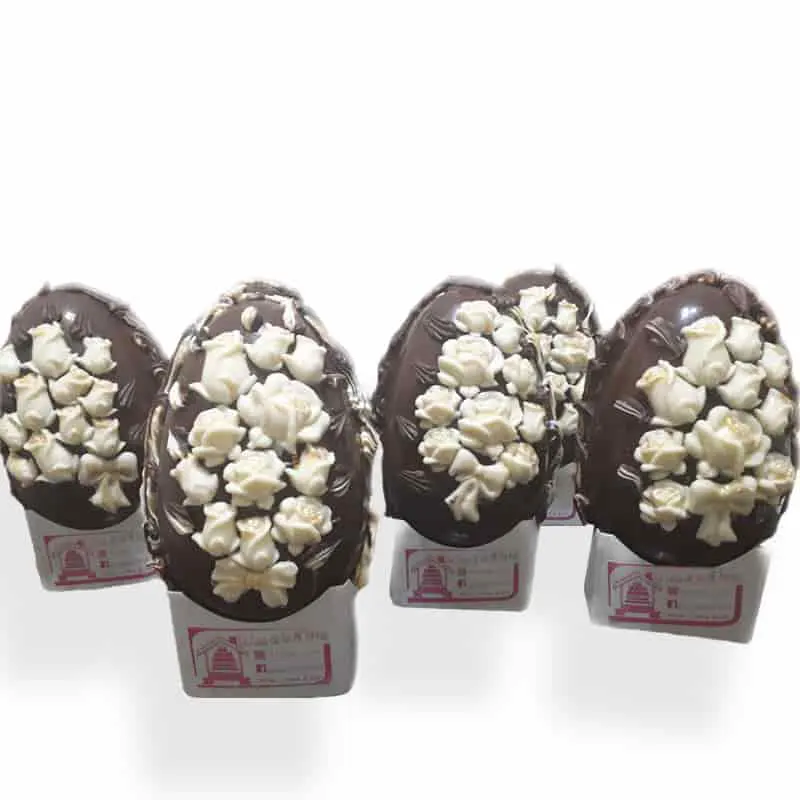 Huevos de Pascua de chocolate con leche o chocolate blanco decorados con delicadas rosas, rellenos de Rocklets de Arcor.