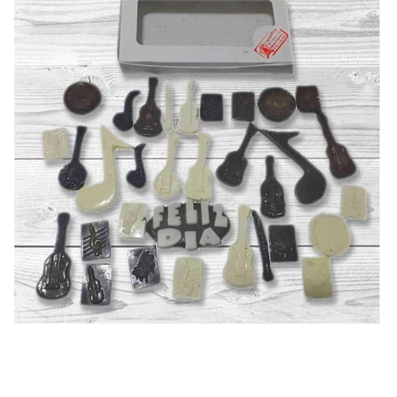 Caja temética musical con notas e instrumentos de chocolate con leche y blanco, presentadas para regalo.