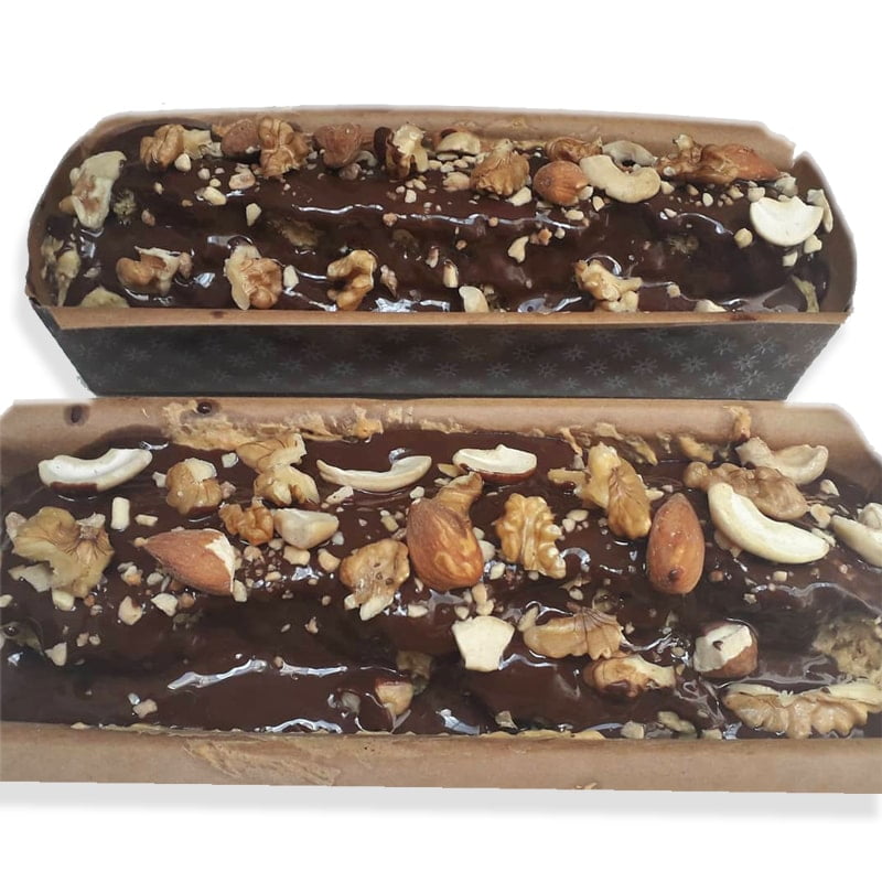 Budín de masa integral sin azúcares añadidos, decorado con chocolate semiamargo y frutas secas.