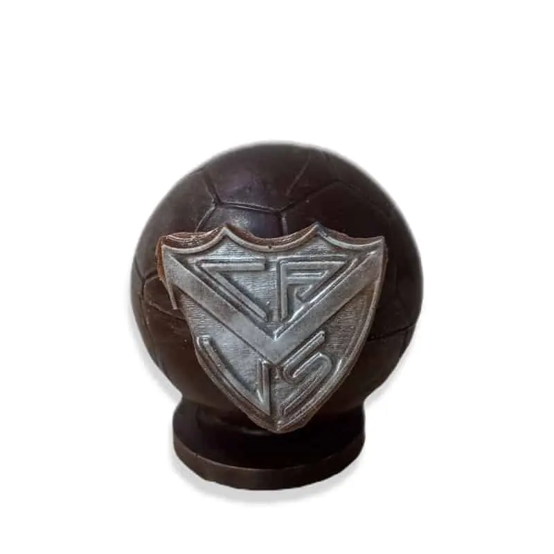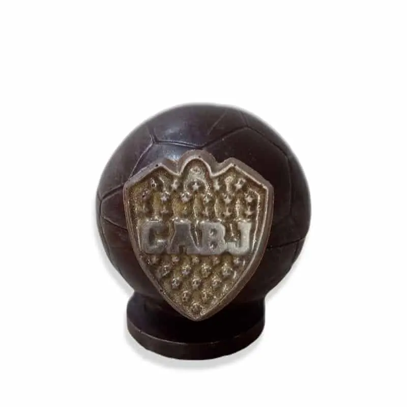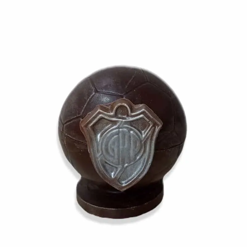 Pelota elaborada de chocolate con leche (250g), decorada con el escudo del equipo. Rellena de Rocklets de Arcor y gomitas.