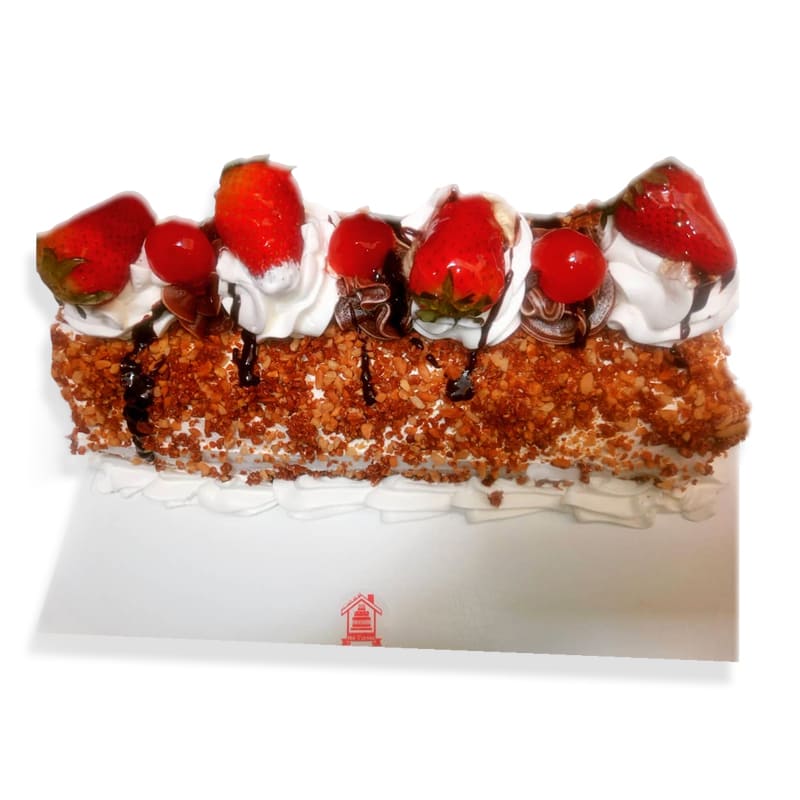 Decorado con crema chantilly, dulce de leche, cerezas y praliné.