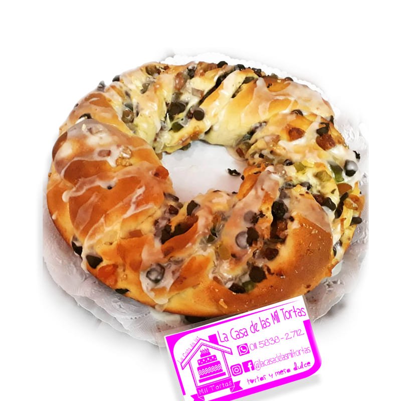 Rosca con masa aromatizada con cítricos, rellena frutas secas, chips de chocolate y bañada con glaseado de limón.