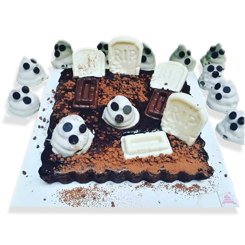 Tarta de chocolate, decorada con divertidos fantasmitas copitos blancos de dulce de leche y figuras de chocolate blanco.