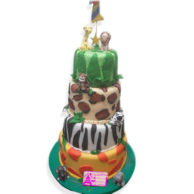 Torta forrada de cuatro pisos, decorada con animalitos de la selva.