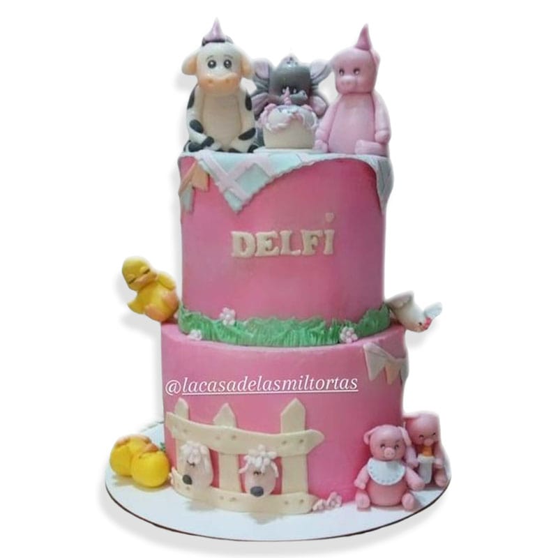 Torta temática animalitos de la granja de dos pisos 30 porciones. Elaboración realizada de bizcochuelos de vainilla con rellenos de crema de chocolate y frutos del bosque.