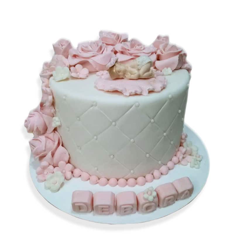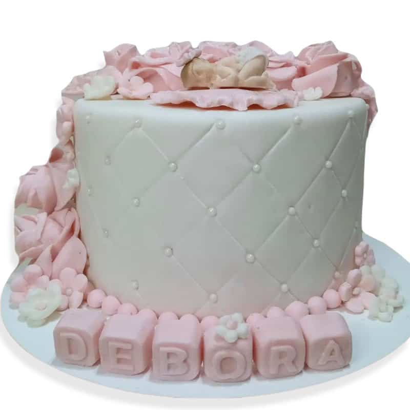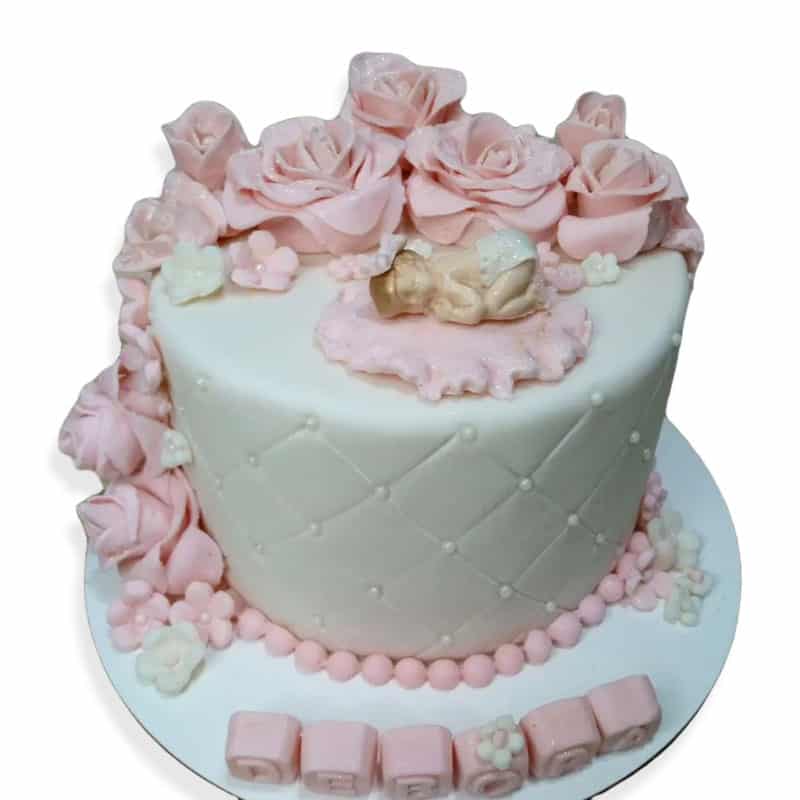 Torta temática para baby shower de 10 porciones. Elaborada de bizcochuelo de vainilla con relleno de chocotorta.