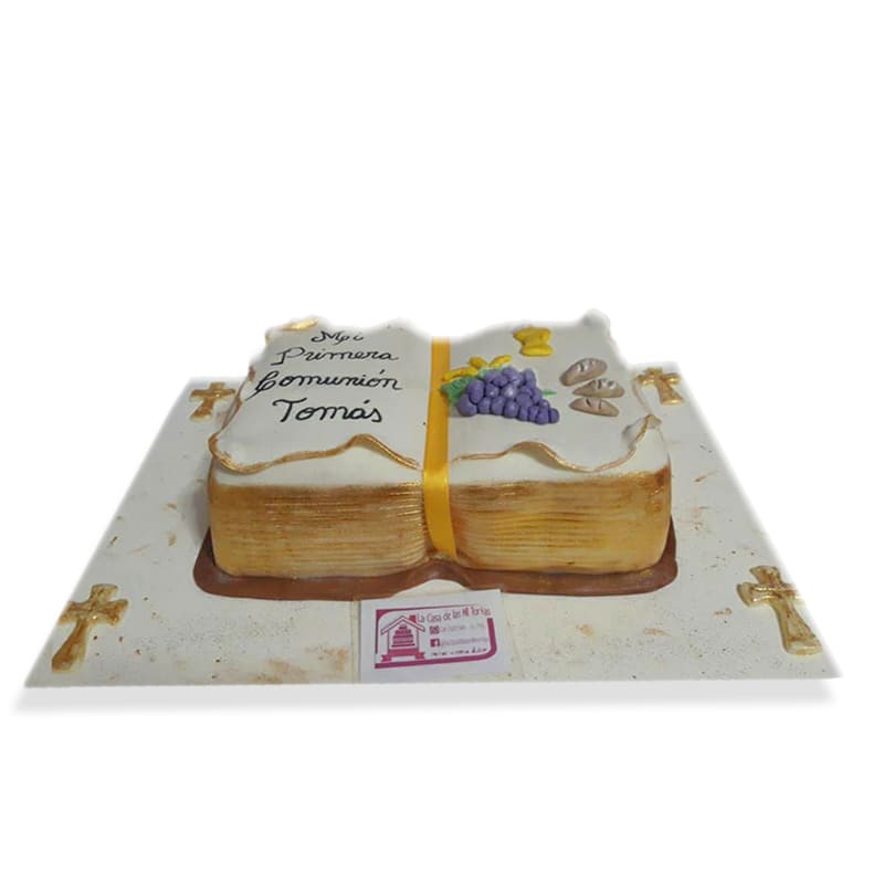 Torta con forma de biblia, personalizada con nombre y decorada con adornos para la ocasión.