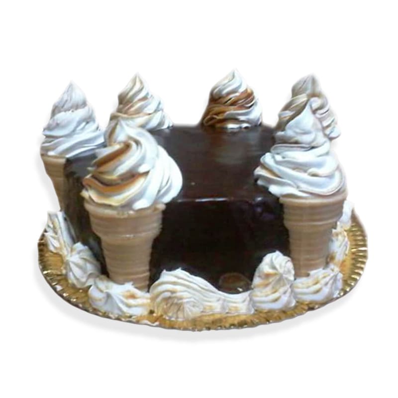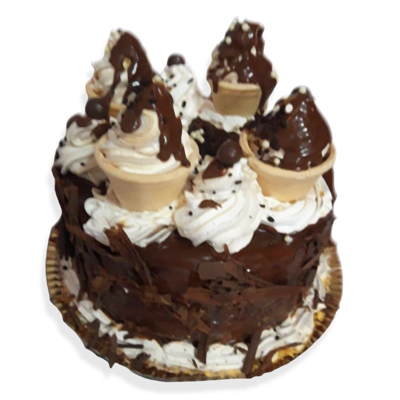 Torta de chocolate decorada con chantilly y cucuruchos de helados.