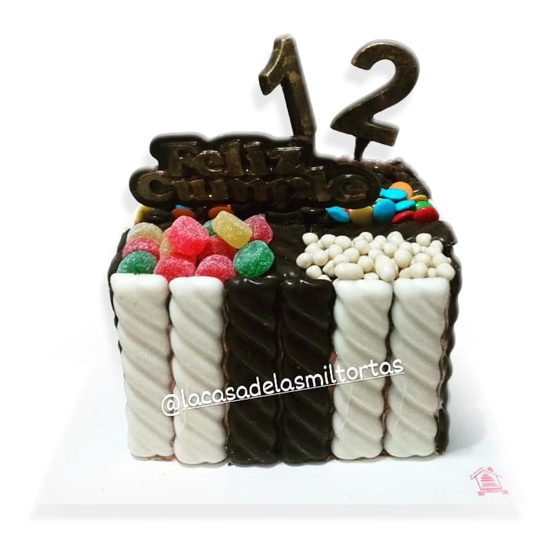 Torta golosinera cuadrada 12 porciones, bizcochuelo mixto rellenos crema oreo y crema chocotorta.
