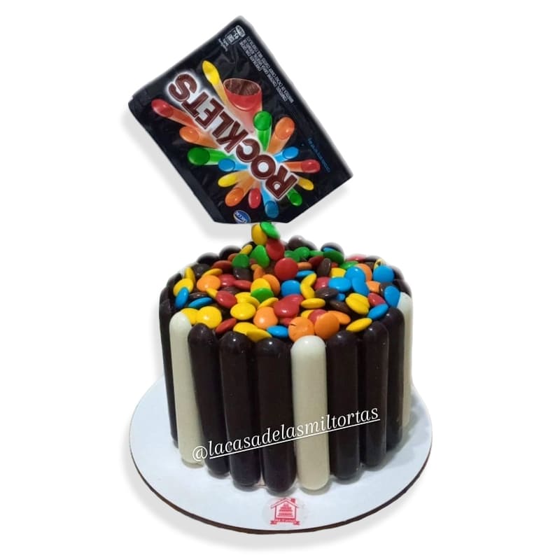 Torta rocklets golosinera 6 porciones de bizcochuelo de chocolate, rellenos crema cabsha y crema flan de vainilla, cubierta de rocklets y chocolates.
