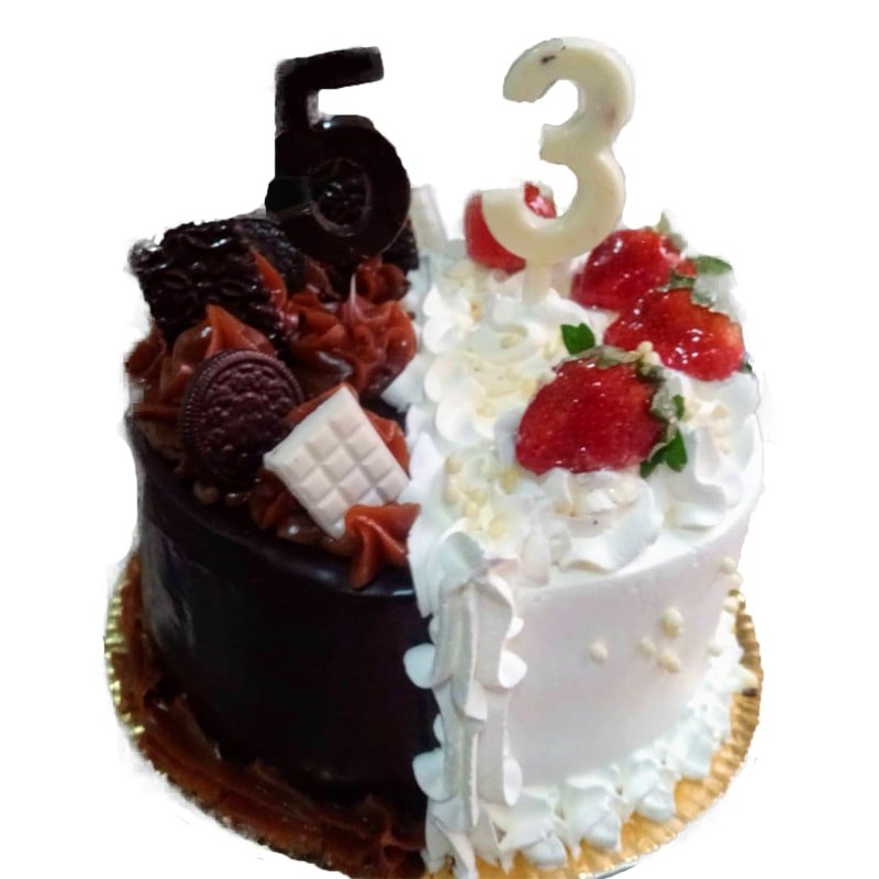 Una mitad, bizochuelo de vainilla, relleno de dulce de leche decorada con chantilly y frutillas.