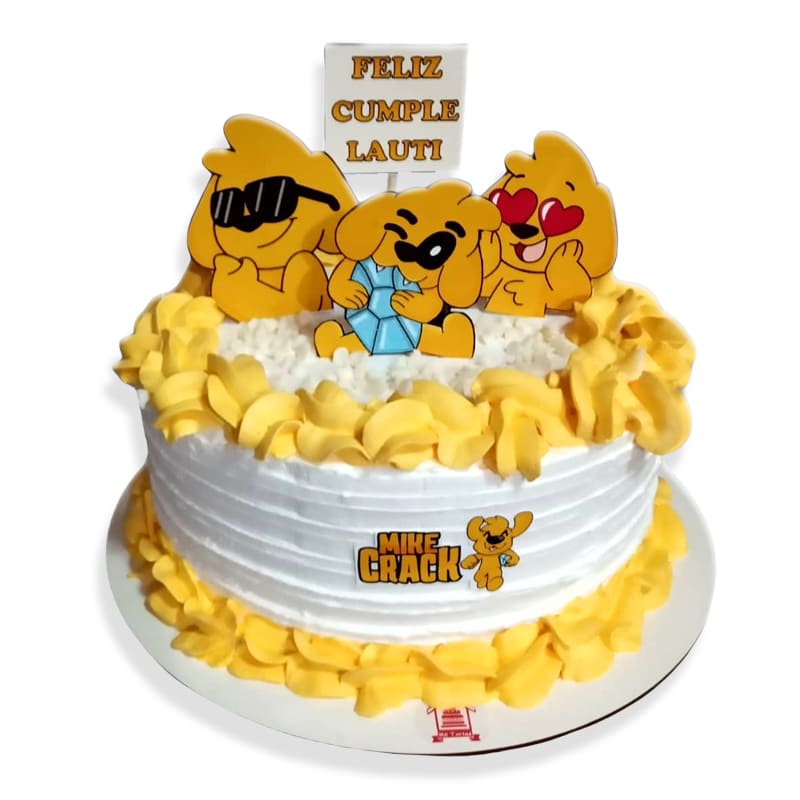 Bizcochuelo de chocolate, relleno de dulce de leche, cubierta de chantilly y topper impresos.