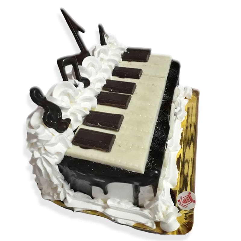 Torta decorada con crema chantilly adornada con teclado en chocolate con leche y chocolate blanco acompañado de notas musicales en chocolate semiamargo.
