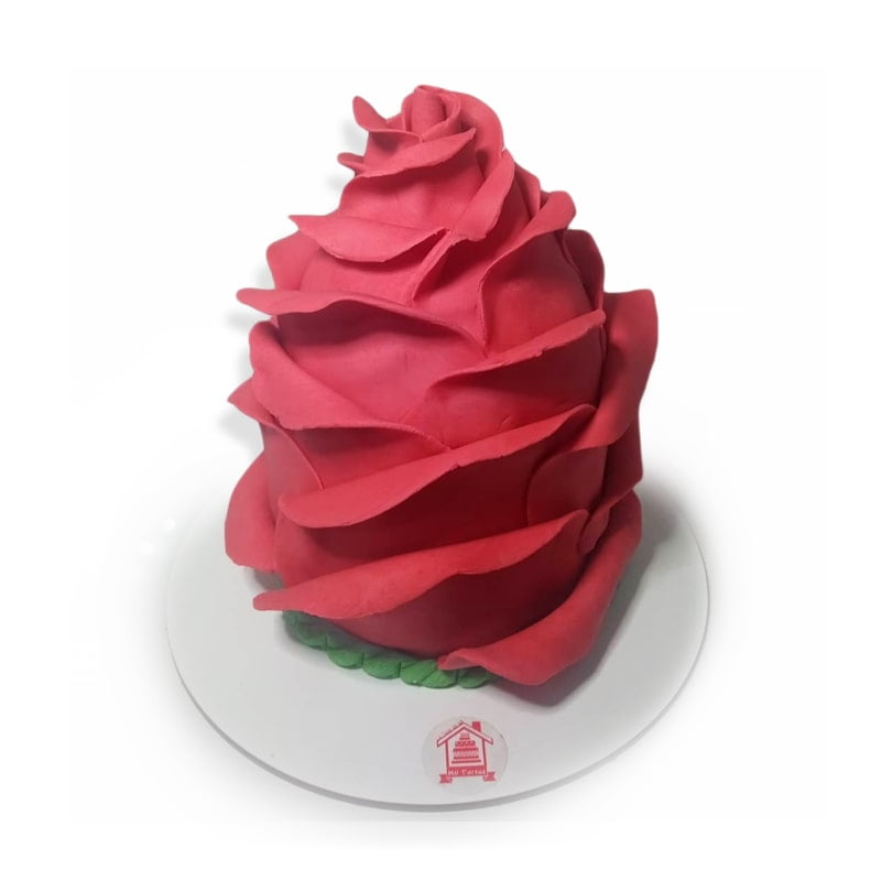 Bizcochuelo de chocolate, rellenos crema de frutilla y crema de chocolate, cubierta fondant casero.