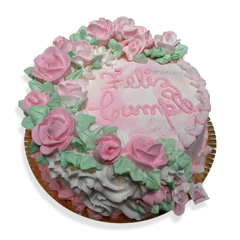 Torta de un corte, doble relleno de dulce de leche y chantilly, decorada con crema.
