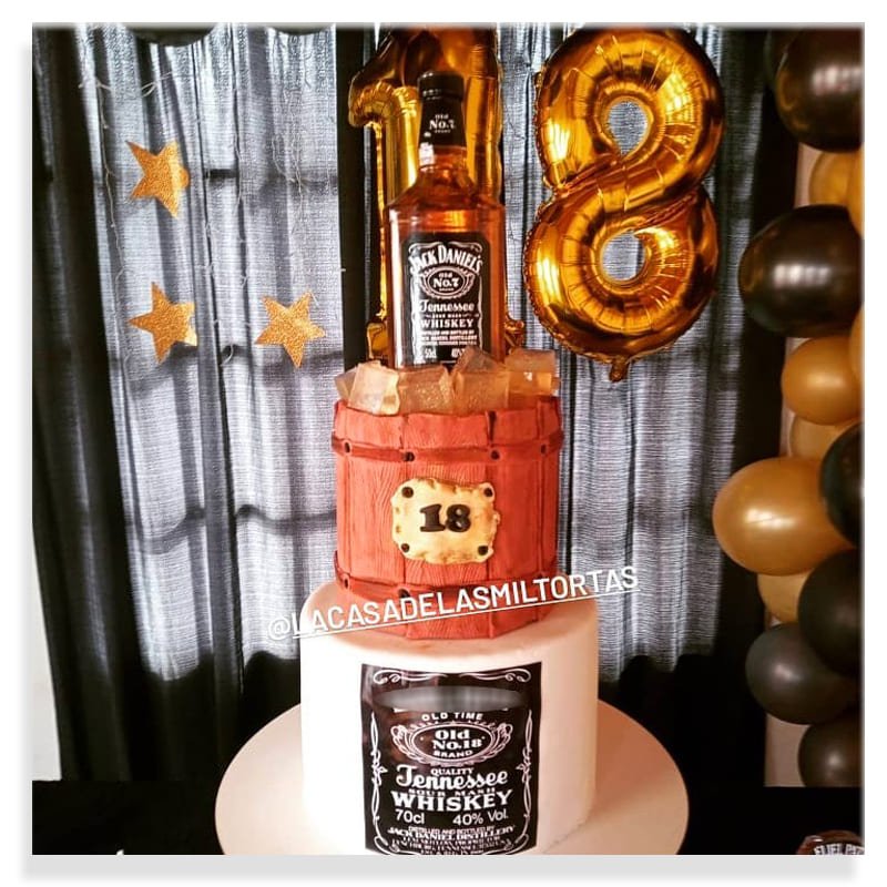 Torta, primer piso, bizcochuelo mixto con cuatro cortes: dos de dulce de leche, crema de chocolate y crema granizada. Segundo piso: bizcochuelo de vainilla en tres cortes, dulce de leche, crema de chocolate y crema granizada. Ambas tortas ganacheadas y forradas con fondant casero. La deco de hielos de gelatina y botella real de wisky Jack Daniel’s .